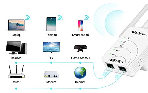 💎 【Velocidad wifi AC1200】 La velocidad de transmisión de datos es de hasta 1200 Mbps, velocidad extendida de 867 Mbps en la banda de 5 GHz y 300 Mbps en la banda de 2,4 GHz. El amplificador wifi Wodgreat puede proporcionar una señal wifi fuerte y estable, puede disfrutar de videos 4K en línea, juegos multiusuario, música, etc.sin demoras ni bloqueos.